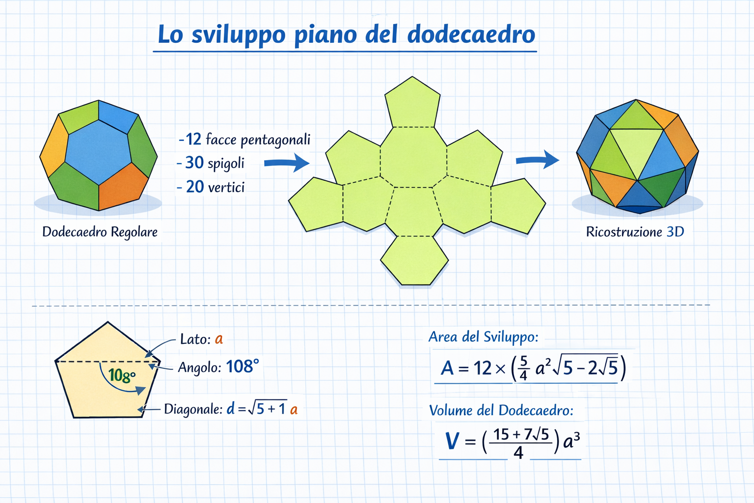 Guida completa al dodecaedro: scopri le formule per calcolare area e volume, le proprietà dei poliedri platonici e le applicazioni reali di questo affascinante solido a 12 facce.