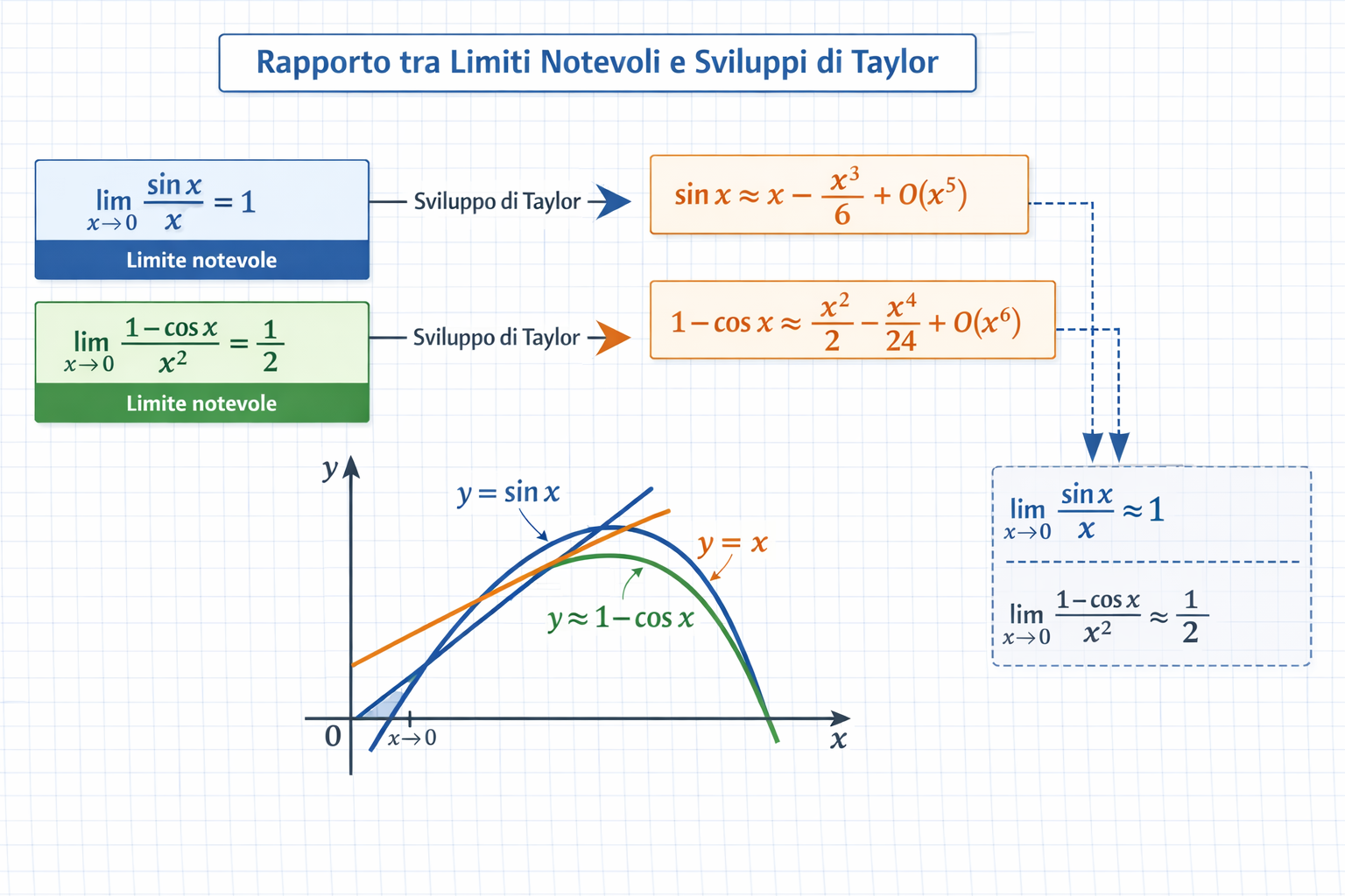| Funzione | Limite Notevole (1° ordine) | Sviluppo di Taylor (fino al 3° ordine) |