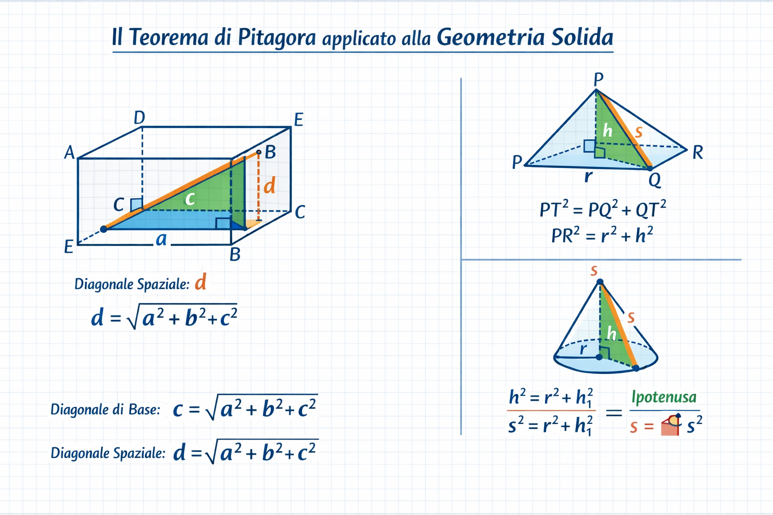 L'estensione del Teorema di Pitagora alle tre dimensioni è un passaggio cruciale per chiunque si occupi di design industriale, ingegneria o grafica 3D. In questo contesto, non ci limitiamo più a lavorare su una superficie piana, ma utilizziamo la formula inversa di Pitagora e le sue varianti per calcolare segmenti che attraversano lo spazio interno di solidi geometrici. La logica rimane la stessa: identificare un triangolo rettangolo "nascosto" all'interno della figura solida per procedere alla risoluzione dei triangoli rettangoli formati dalle proiezioni ortogonali.