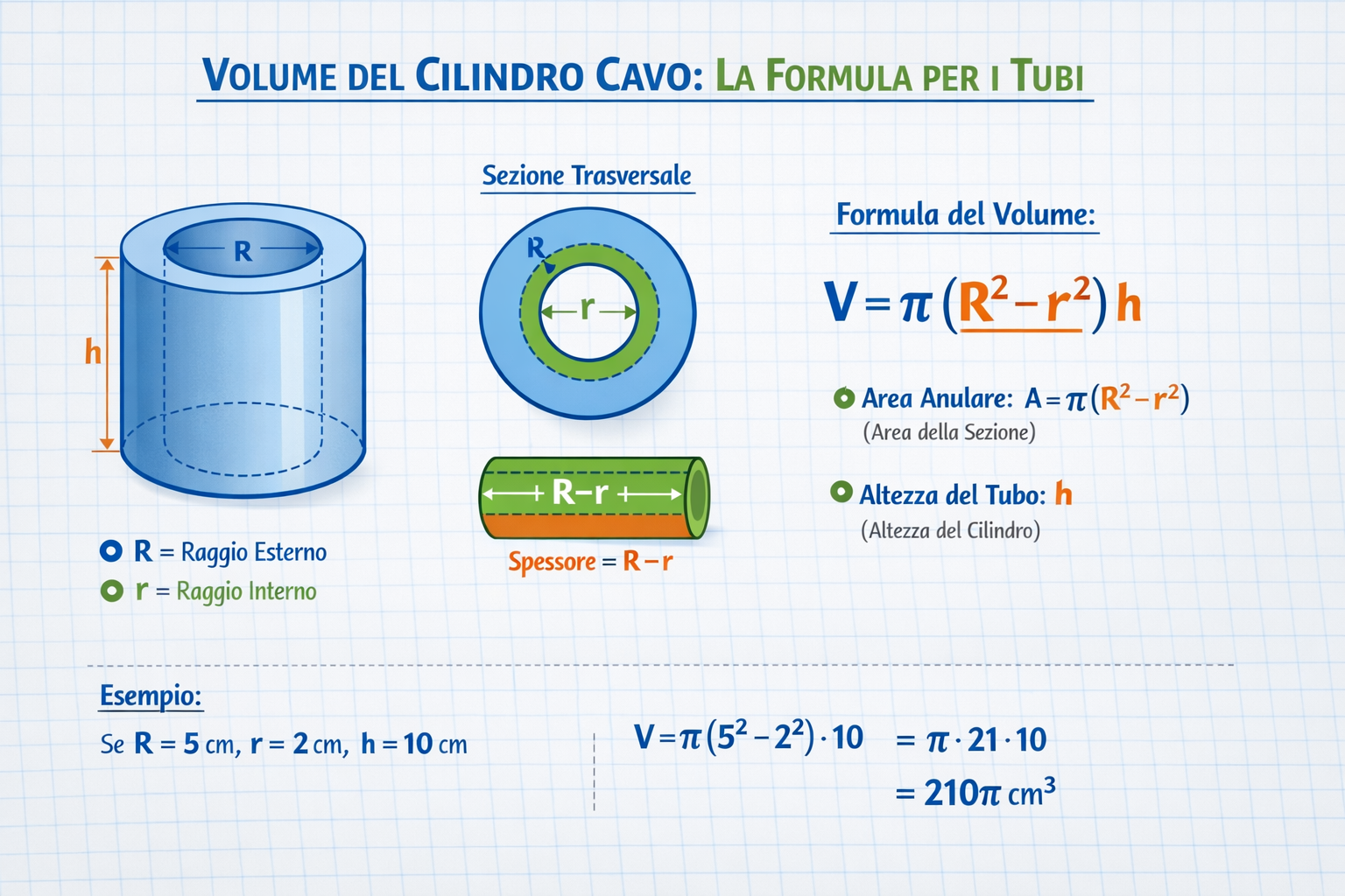 La distinzione fondamentale risiede nel raggio. Avremo un raggio esterno () e un raggio interno (). La sezione trasversale di questo solido non è un cerchio pieno, ma una corona circolare. Di conseguenza, l'area di base cilindro cavo si ottiene sottraendo l'area del cerchio minore da quella del cerchio maggiore. La formula risultante per il calcolo volume tubo è la seguente:
