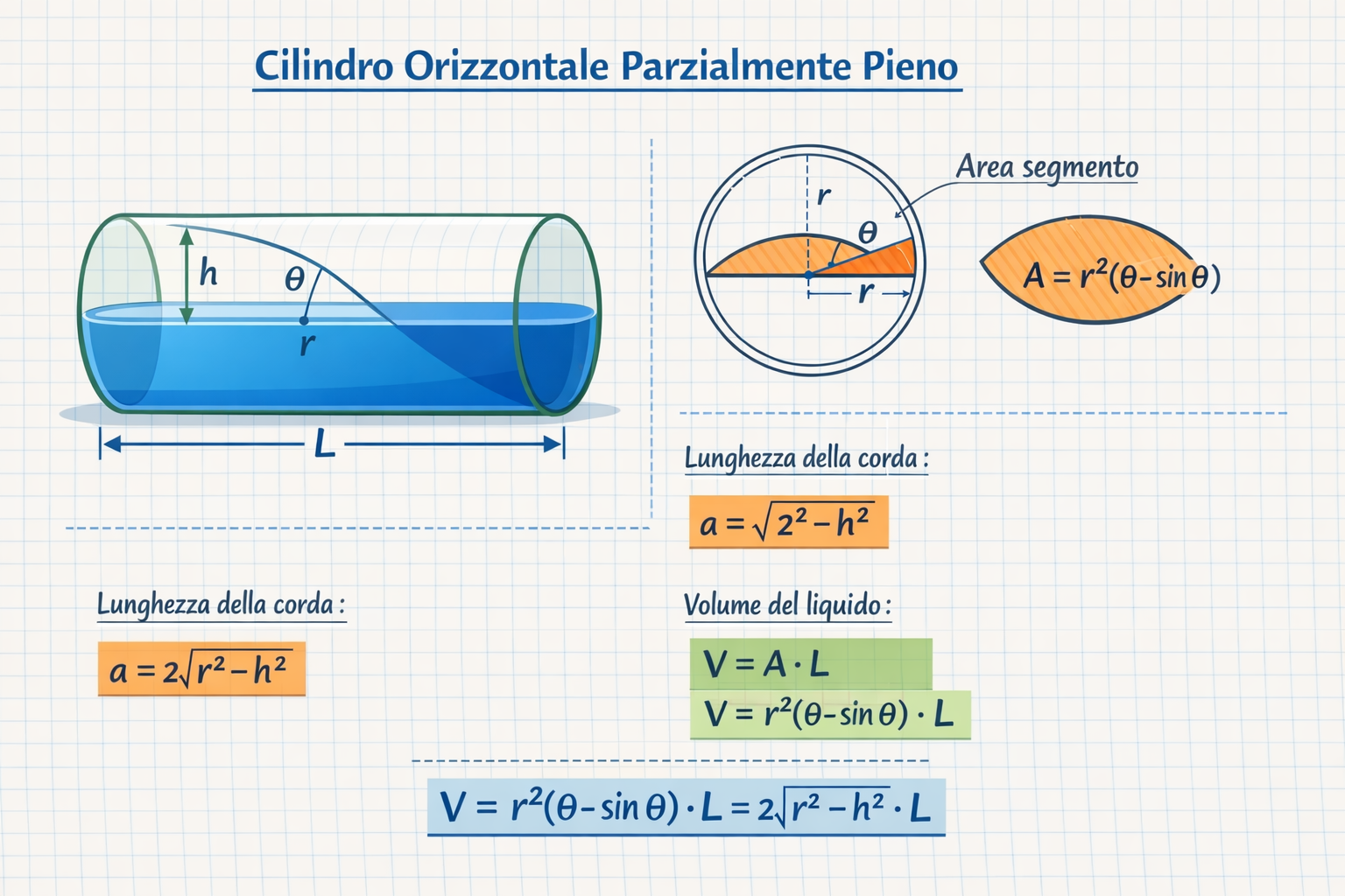 Una volta ottenuta l'area della sezione bagnata, il calcolo volume tubo o serbatoio si completa moltiplicando tale area per la lunghezza () del cilindro. È un calcolo che richiede precisione: un piccolo errore nella misurazione del livello può portare a discrepanze di decine di litri, specialmente quando il livello si trova in prossimità del diametro centrale, dove la variazione di volume per unità di altezza è massima. Per approfondire le basi trigonometriche necessarie a queste funzioni inverse, è possibile consultare la definizione di segmento circolare su Wikipedia.